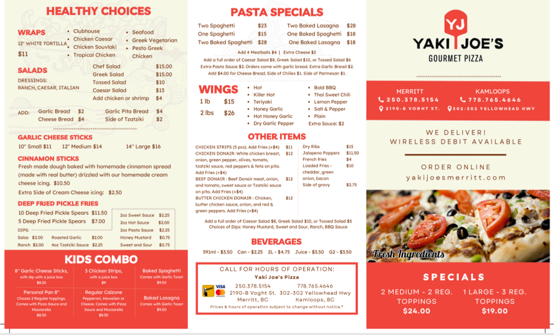 Whether you’re winding down after a day out or simply looking for a familiar, reliable meal, the offerings at Yaki Joe’s provide a welcoming and unpretentious taste of pizza and Italian comfort food in Merritt.